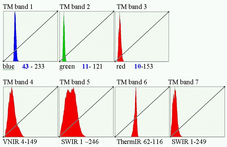 Below are some histograms from a previous “demo” image queried using ERMapper (a remote sensing program we used to use until it was bought by another company that made it ridiculously expensive….). It is from Landsat 7 (so the sensor is TM+). What bands would these be in Landsat 8?