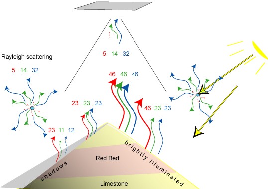 Note how the visual bands are shifted to the right. If you click in the darkest shadows on the image you can estimate the amount of haze shift in Red Green and Blue. This cartoon illustrates a scenario with haze.