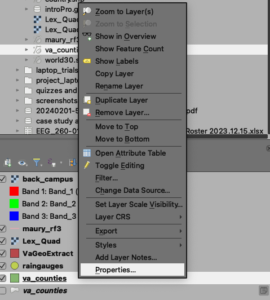 - or right-click on the “VA_counties” layer, and change the way the data are plotted using the symbology tool on the “Properties” tab.