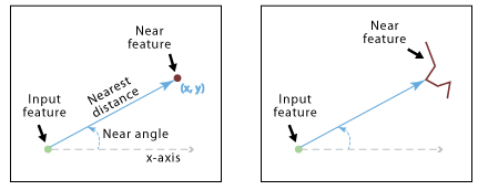 • What is the closest feature (or features, or points) to another feature or point (output by new feature or new table).  QGIS has tools to find the closest line or polygon centroid and add it to the Input feature attribute table. ArcGIS does the same but uses the line perpendiculars and polygon perimeters rather the centroid. We could play with they using the rivers and the rain gauges for example. In ArcGIS, Use the Near tool from the Proximity toolset. For distance ArcGIS calculates distance differently.