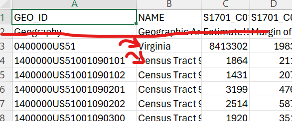 - only one header row (not the two or three that the census table gives you. I don’t think you need the “all virginia” row, but you can use the table without it